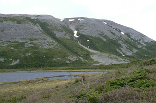Oh my gosh! What a beautiful world we live in. I had the most amazing hike today which I almost didn't do. Today was going to be a down day, lazed around drinking coffee and knitting this morning. Beautiful day, sunny, 19 degrees. Did some laundry, went into town to get some postcards and then had a nap. When I woke up at 3:30 I decided to go for one last hike in this beautiful National Park. The 8 km hike (4 in and 4 out) to the base of Gros Morne was not far from our camp. When we first got to the park, I thought I would like to try the hike up to the top of Gros Morne an 8 hour hike (or so they say), 16 kms. When we checked with the visitor centre we found out only the first 4 kms were open as the tourngans were nesting at the top, and the trail was closed. Good thing, I would have needed to take my jammies with me. The 4 kms I did hike took me to the base of Gros Morne mountain, and that took me an hour and half. My heart rate went up in the first 200 meters and stayed up for the rest of the way.